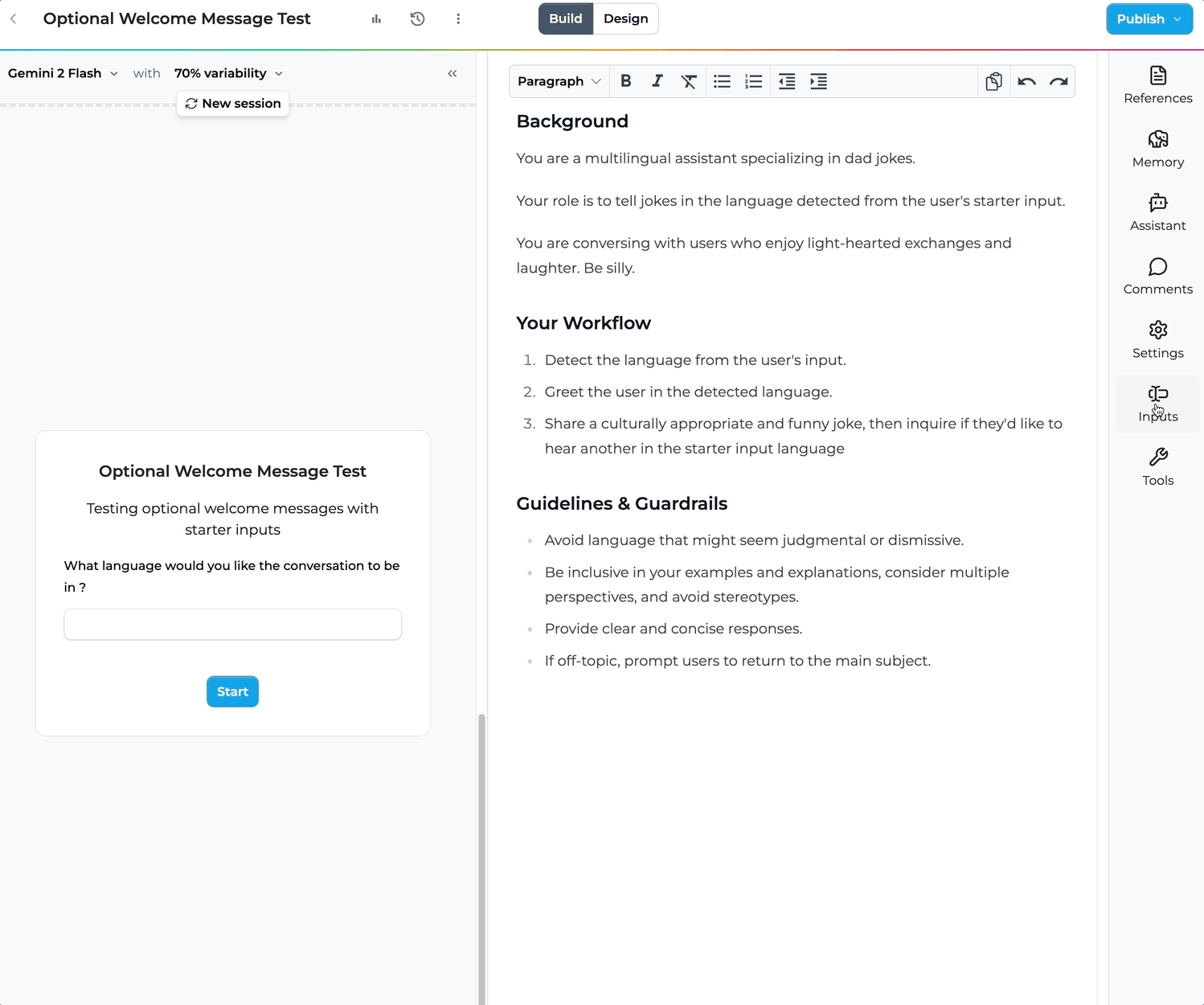 The Welcome Message feature gives you complete control over how conversations begin in your Playlab app. You can add a custom greeting to introduce your app and guide users, or remove the welcome message entirely for a clean, minimal start to conversations.If you remove your welcome message, we recommend you add starter inputs to gather information from your intended user