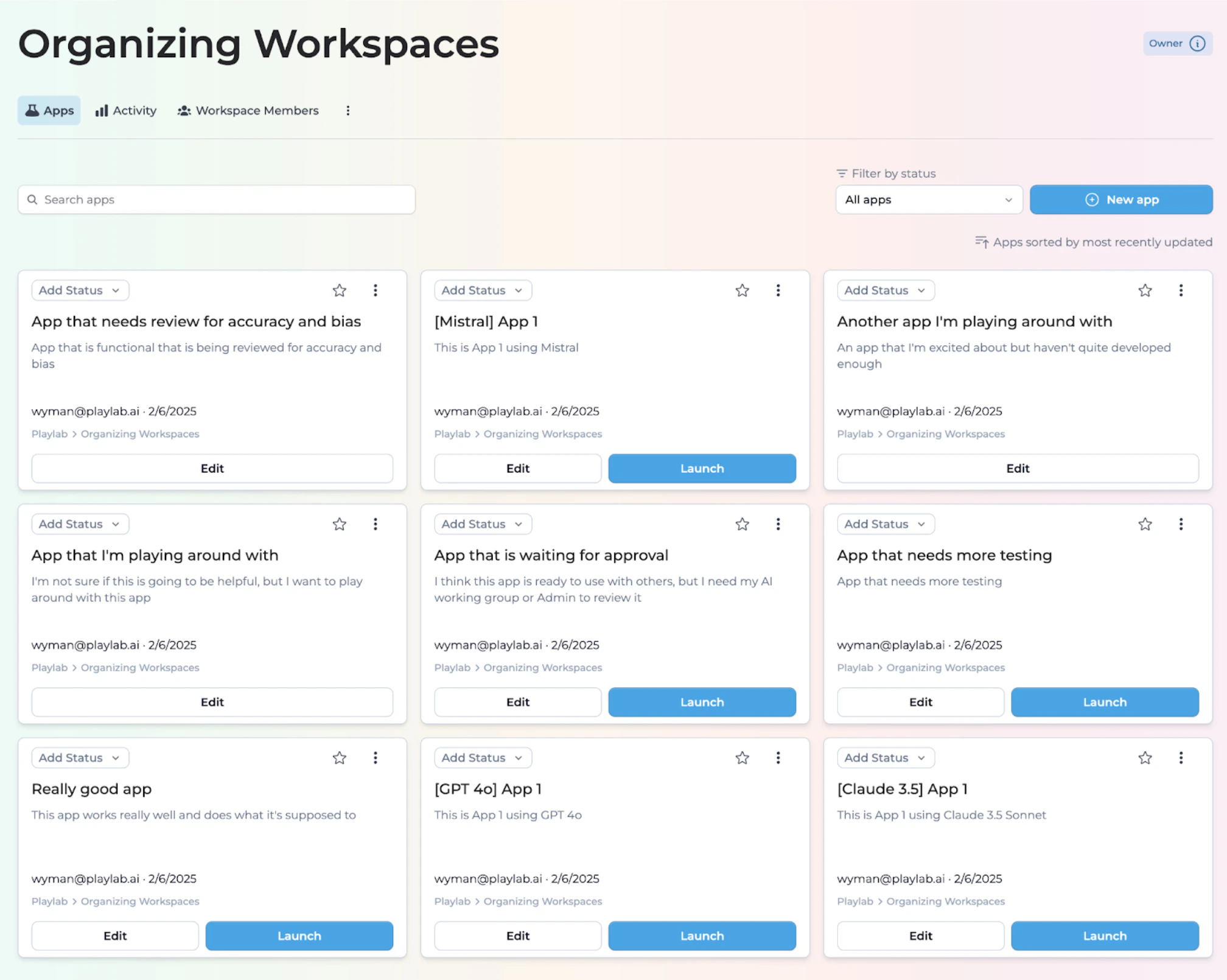 Help organizations better organize and distinguish between apps in their Playlab workspaces based on development status. This feature allows you to categorize your apps by different status designations to clearly indicate their stage in the development lifecycle.Rationale for the feature