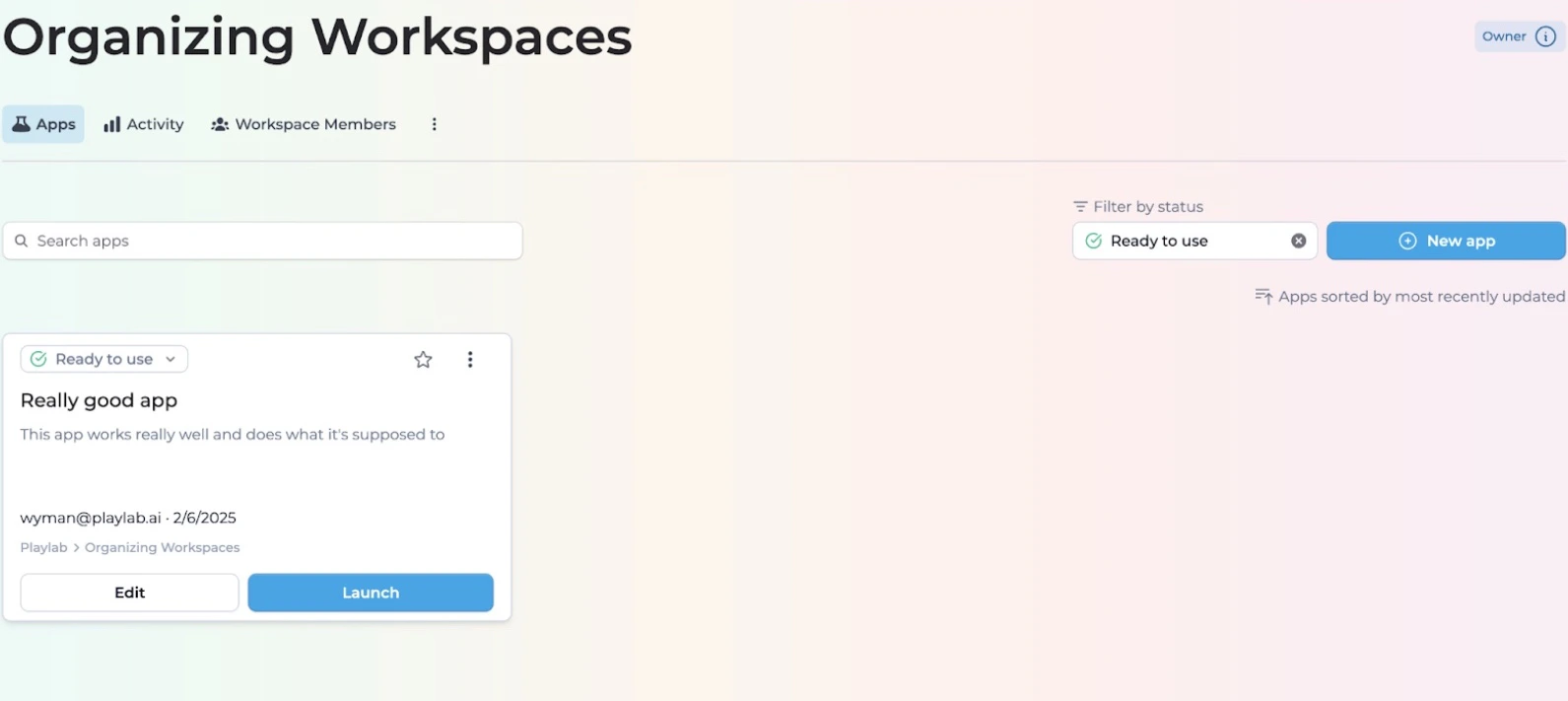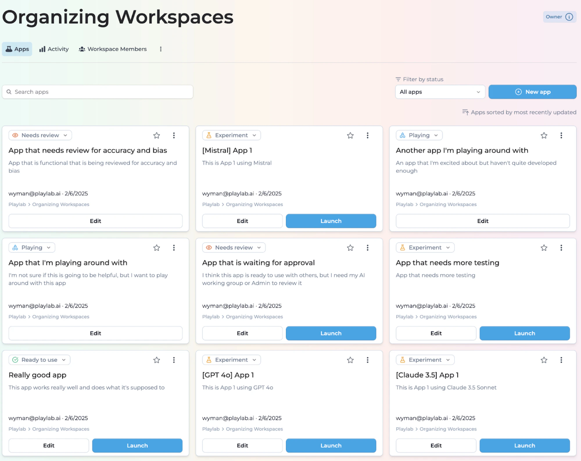 Users looking at a workspace full of apps don’t have a clear idea of which apps are complete and ready to be used and which are half baked or still in progress. This feature provides visual cues and filtering capabilities to help teams better understand the status of each app in their workspace. As you build more apps, organization becomes essential. This feature helps you manage your growing collection of Playlab apps by clearly identifying their current development stage.Status Designations