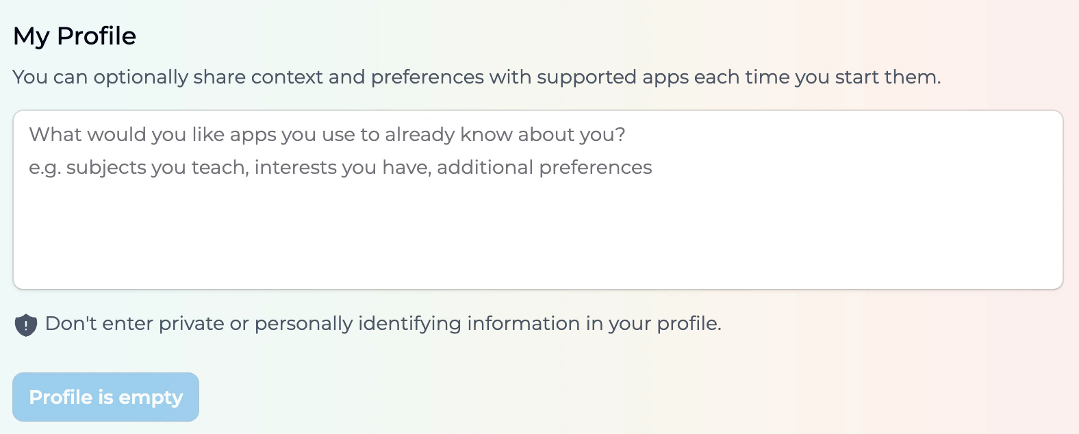 This feature allows Playlab users to create personalized experiences with AI applications by providing context about themselves, their preferences, and their goals. User profiles help the AI understand who you are and tailor responses accordingly. By defining your preferences, background, and needs upfront, you can receive more relevant and customized responses from Playlab apps without having to repeatedly explain your context in each interaction.How do I set up my user profile?