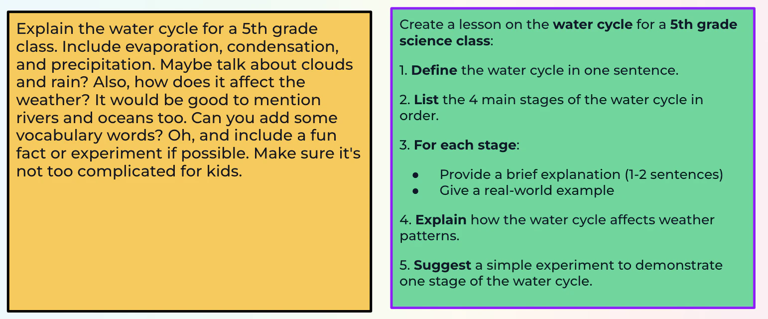 • Consider structuring prompts like a lesson plan with outcomes, steps, and examples